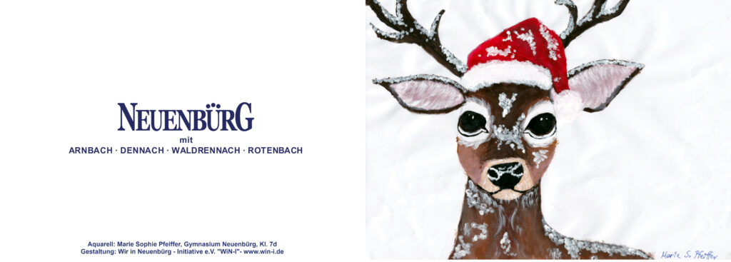 WiN-I hat mit diesen Motiven die Wintergrußkarten 2025 gestaltet. Die Karten (Klappkarten, DIN A6, außen bedruckt, innen weiß) sind gegen Spende an WiN-I erhältlich bei Büro Müller (Wilhelmshöhe), kreuz&quer (Arnbach), Little Italy (Städtle) sowie über die Homepage www.win-i.de, per E-Mail an kontakt@win-i.de oder über das Kontaktformular